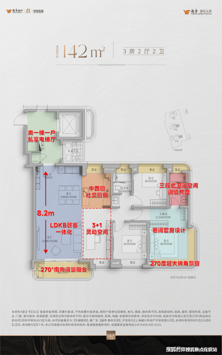 【越秀静安天玥官方售楼处咨询热线㎡户型同样沿用142㎡户型的高端配置,类一梯一户,私享电梯厅空间;正三房空间尺度,适应全龄家庭居住需求;约3.8M一体化主厅,以直通进深约1.6米阔景阳台,形成一个纵向舒适的大场域,自由朗轩尺度,肆意享受阳光的温暖和海风拂面的凉爽;峯范套房主卧,配置飘窗拓展空间;约4.5㎡独立卫生间,干湿三分离空间,人性化细节考究,再次让所有人感受到了静安天玥的静奢主义美学。