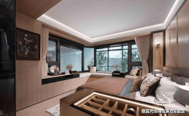 270°超大转角飘窗:是主人仰望浩瀚星空的所在,俯瞰满目绿意。三玻两腔Low-e玻璃系统窗,保证了主卧的极度静谧,兼顾功能与情感维度,创造全新的生活方式。