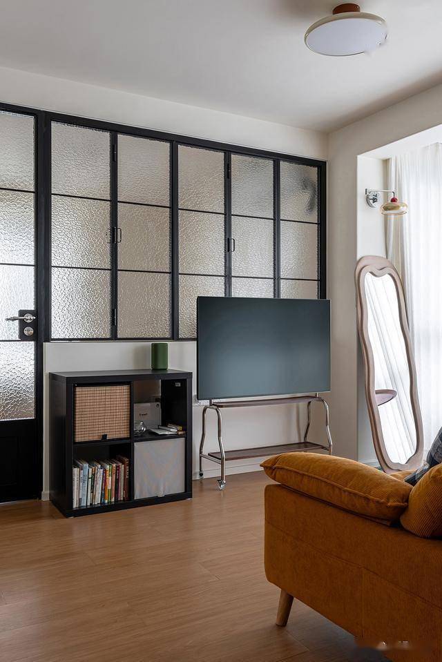 客厅与卧室之间使用黑钢玻璃做隔断,划分不同功能空间的同时,视觉显大又通透,对于小户型来说值得借鉴。